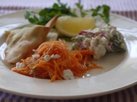 サーモンとアボカドを包んだ焼き春巻き。 得意のキャロっロラペに春らしい白和えを添えて! |